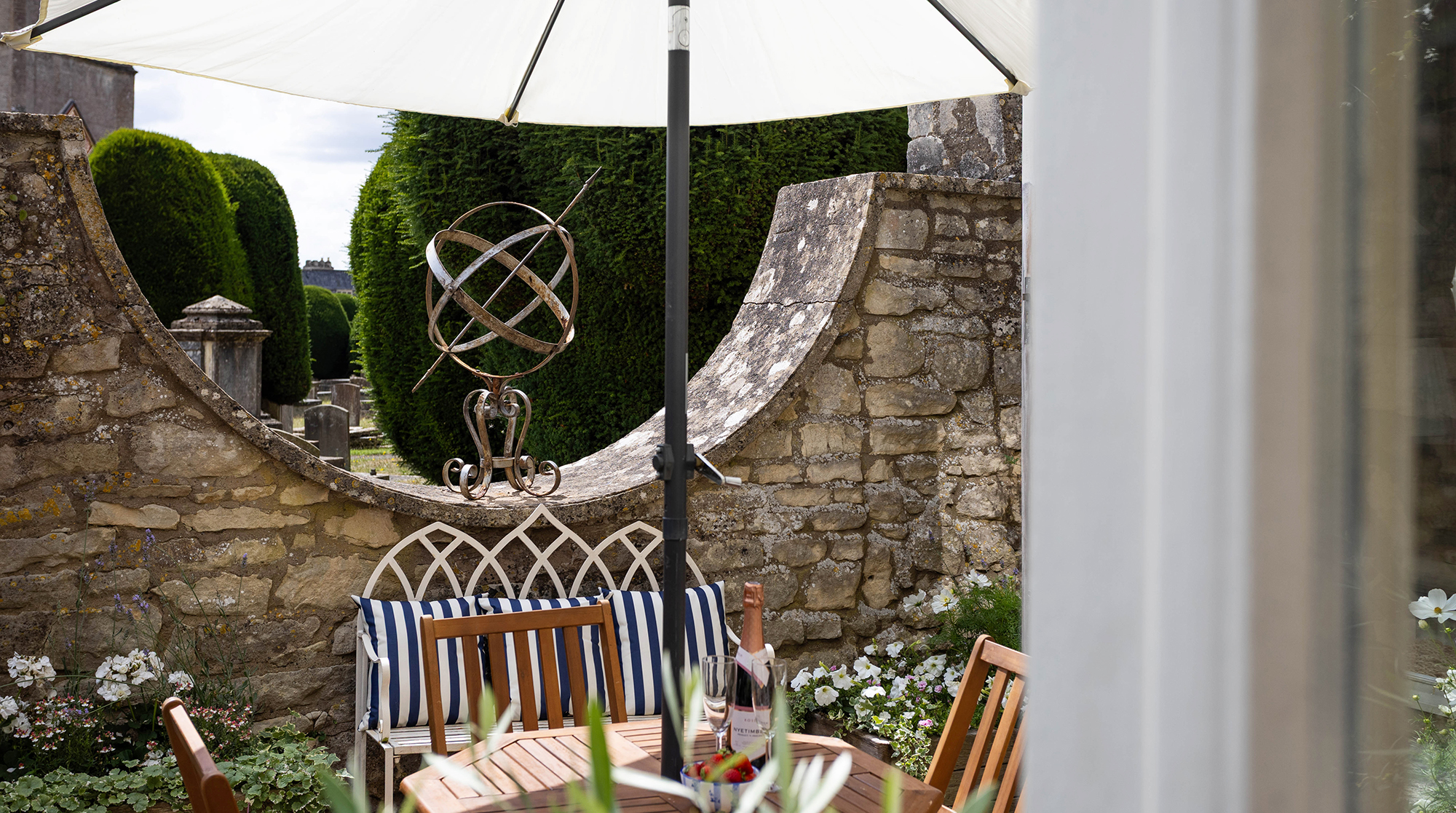Enclosed and private, the courtyard garden is framed by a curved Cotswold stone wall that beautifully frames the church tower beyond. It’s a quietly atmospheric space for outdoor dining, reading or unhurried afternoons between walks.